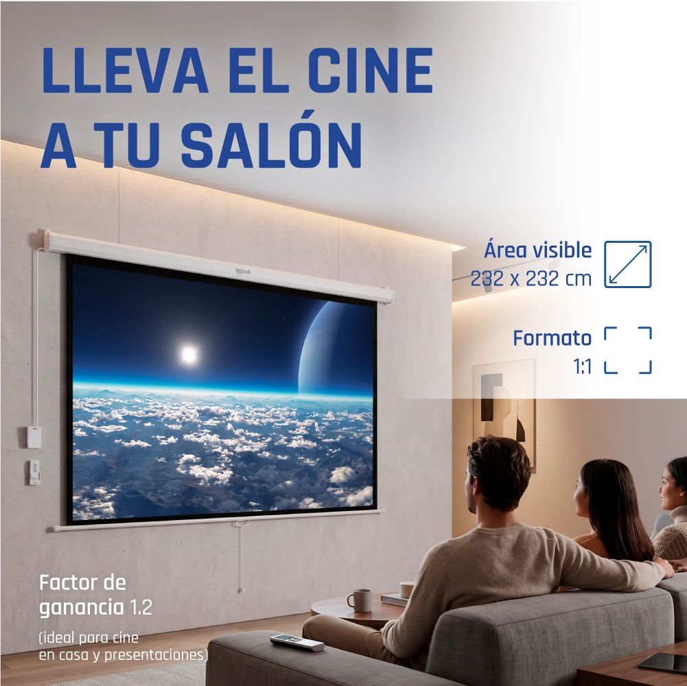 | Contenido | - Contenido del embalaje - Pantalla para proyección 240 x 240 cm - Control de pared - Mando remoto infrarrojo (IR) - Hoja de instrucciones - NOTA IMPORTANTE: no incluye tornillería, tacos ni ganchos para su instalación |